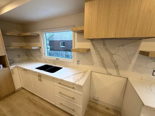 A bright, airy kitchen filled with warmth and sophistication. Natural wood tones and marble-inspired surfaces create a perfect gathering space.